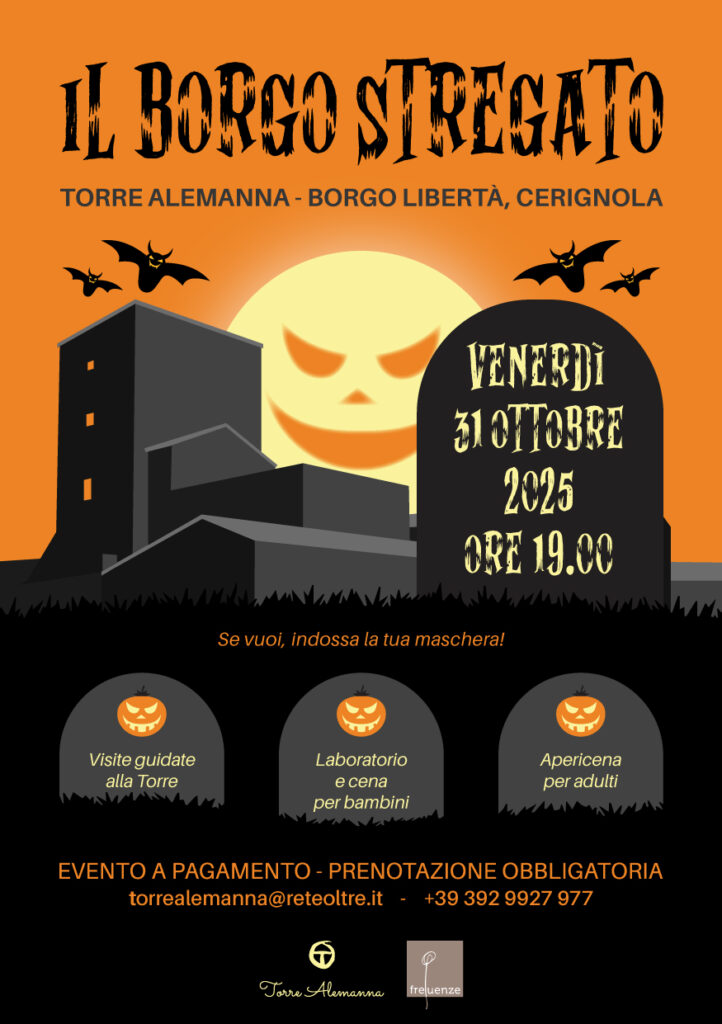 Gioiello di storia, architettura ed arte nel cuore della Daunia, a 18 km da Cerignola, la partecipazione a “Il Borgo Stregato” permetterà di conoscere maggiormente le bellezze storiche, culturali ed architettoniche di Torre Alemanna al fine di costruire cittadini del domani partecipi della vita della comunità, inseriti e protagonisti del proprio contesto quotidiano. «Un’esperienza diversa dal solito – dicono i promotori – con un mix di mistero e convivialità, per vivere insieme la notte più spaventosa dell’anno».