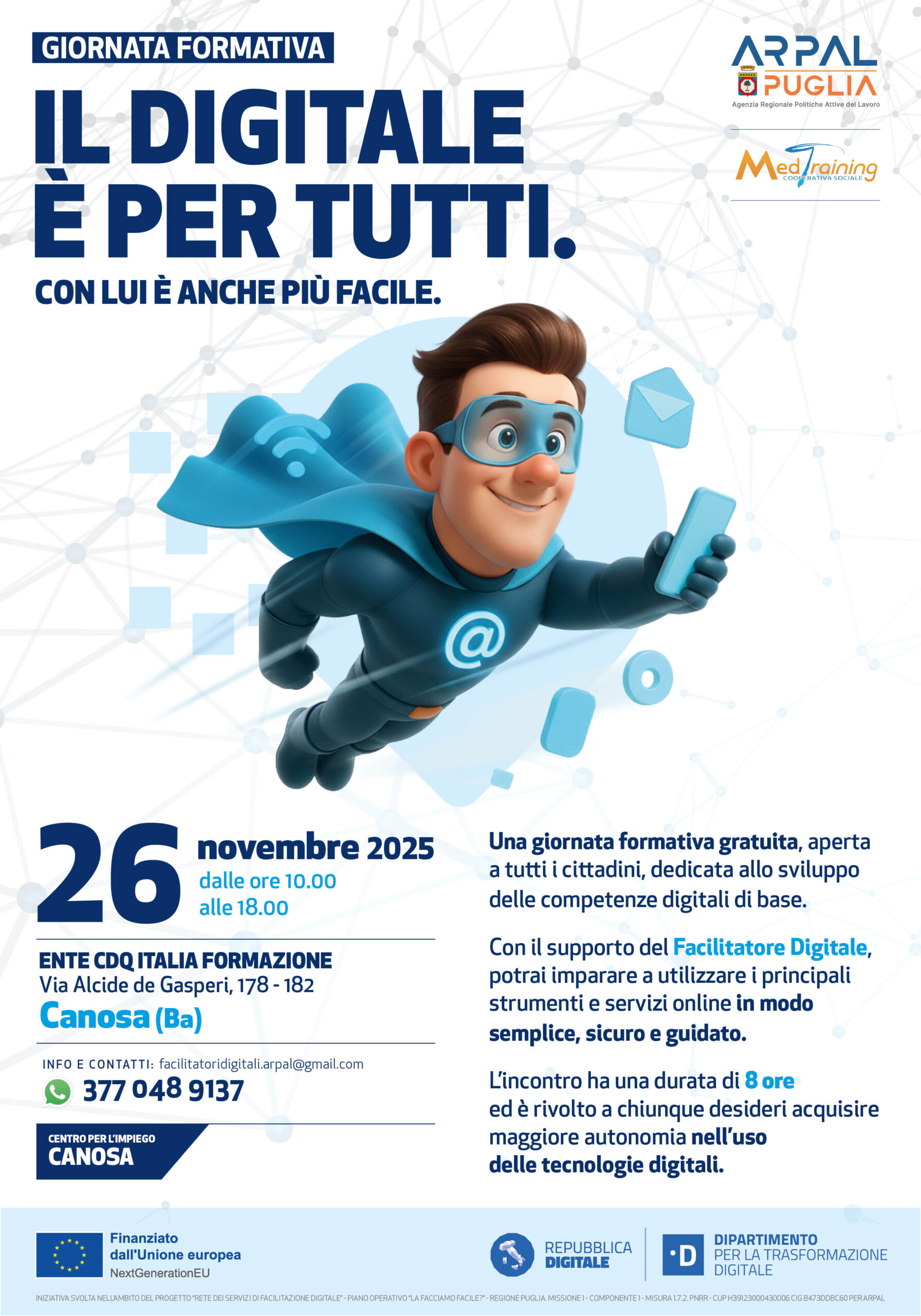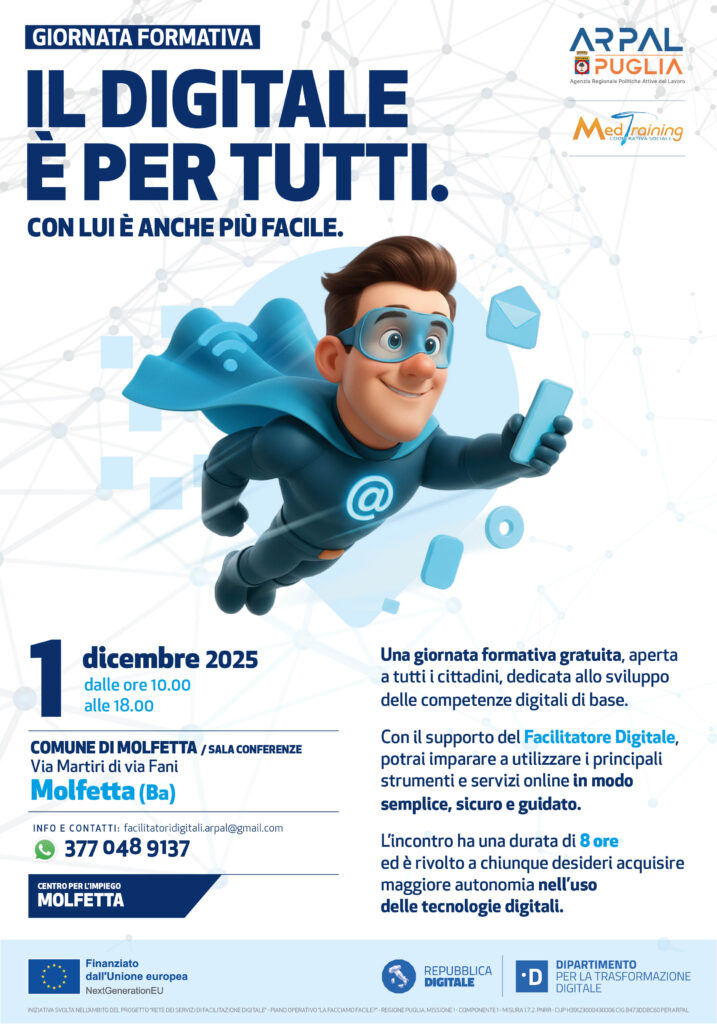 “Il digitale è per tutti. Con lui è anche più facile”. È il messaggio che accompagna le giornate formative che la cooperativa sociale Medtraining sta organizzando nell’ambito del progetto “Rete dei servizi di Facilitazione Digitale” – Piano Operativo “La facciamo facile?”. L’obiettivo del momento di formazione è quello di colmare il divario digitale, insegnare l’uso di base degli strumenti digitali e presentare le opportunità offerte dal progetto di facilitazione digitale di ARPAL Puglia. L’iniziativa ha dunque l’obiettivo di favorire inclusione sociale e la promozione dell’alfabetizzazione digitale nei 44 Centri per l’Impiego (Cpi) gestiti da ARPAL Puglia in cui è presente la figura del Facilitatore Digitale. In ogni comune coinvolto, quindi, è possibile partecipare gratuitamente alla formazione in cui vengono offerte una serie di informazioni utili a tutti i cittadini e le cittadine che desiderano imparare e usare in modo semplice e sicuro i principali strumenti digitali e i servizi online.
